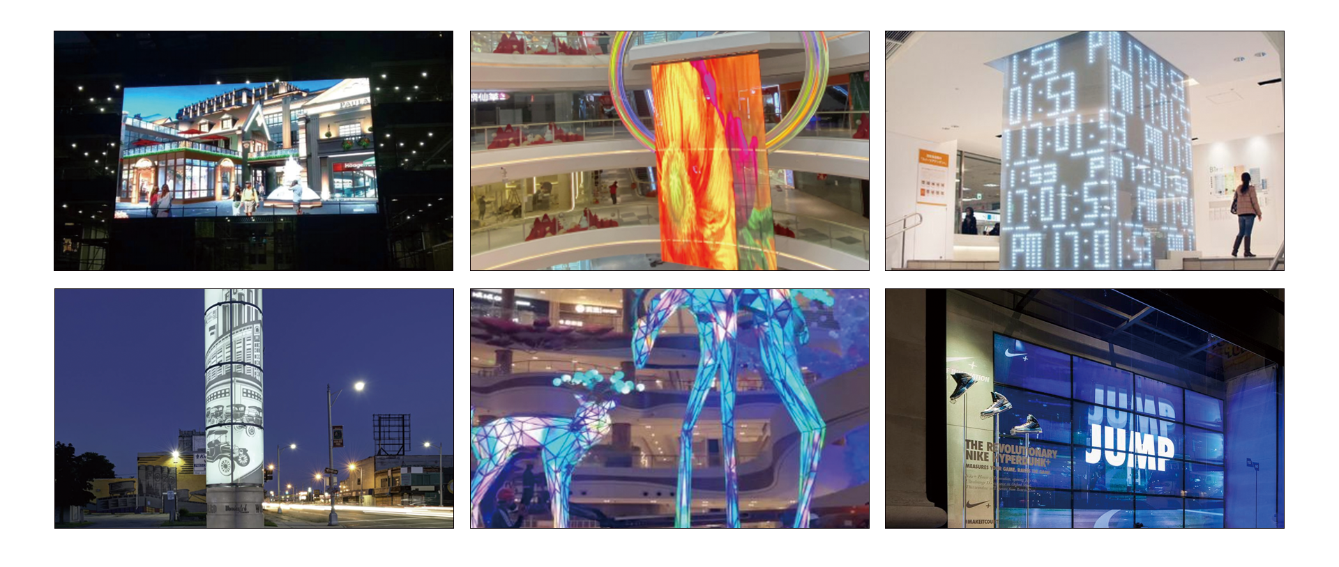 FA transparent screens can be applied in many placessuch as: theaters, shopping centers, municipal buildingsbanks, landmark buildings, hotels, chain stores, ect.